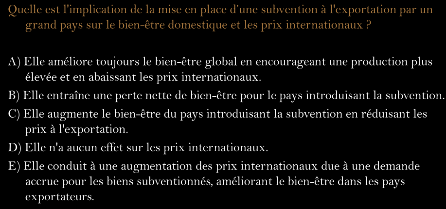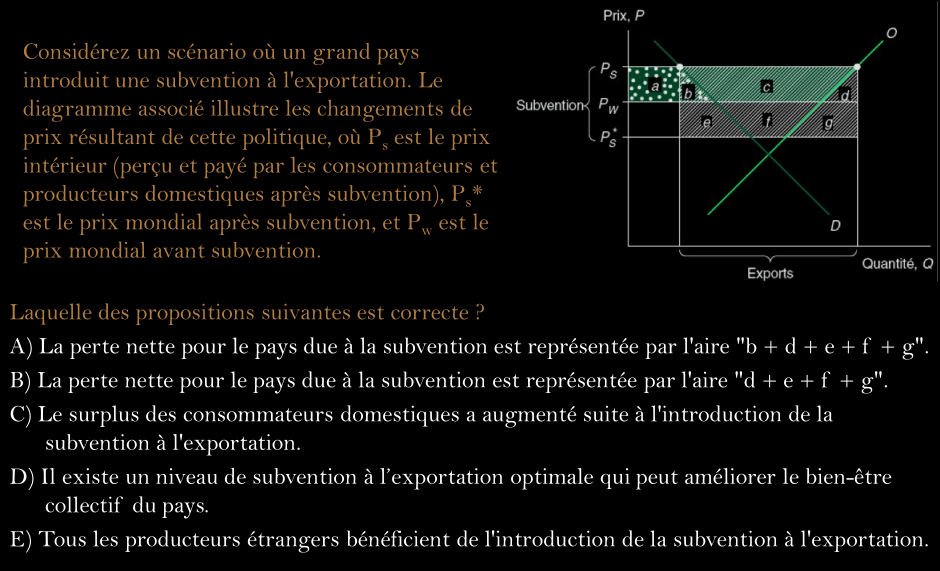 - Analyse de l’impact sur le bien-être suite à l’introduction d’une subvention à l’exportation par un grand pays (qui peut influencer les prix internationaux).