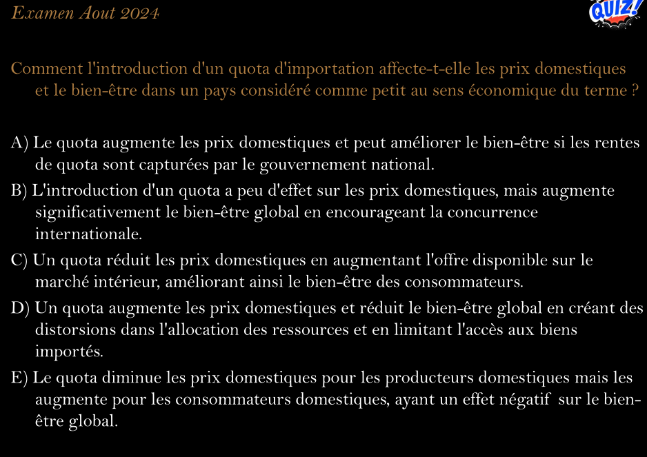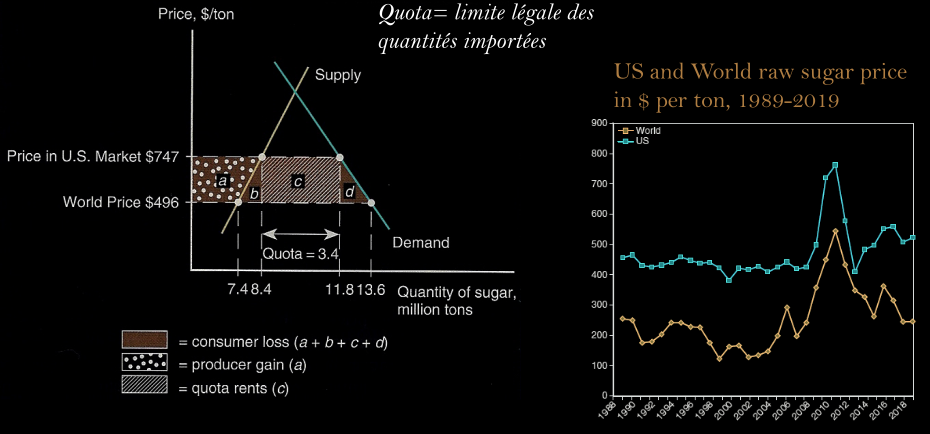 - Si contraignant: augmente systématiquement le prix domestique dans le secteur protégé par le quota.