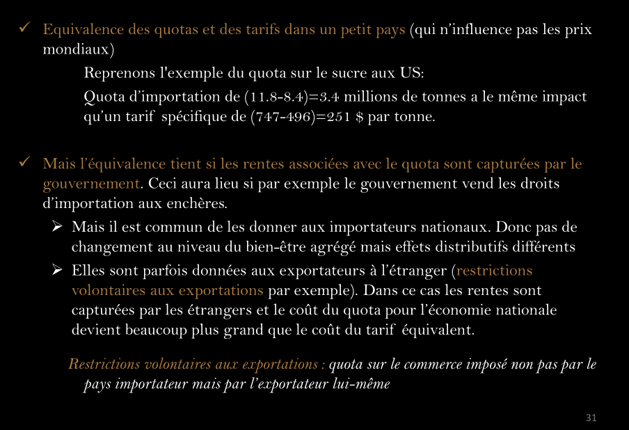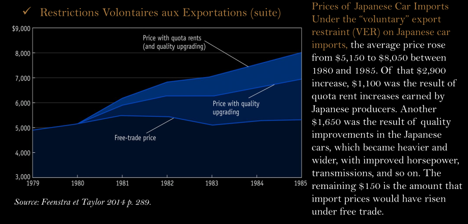 - Les Restrictions Volontaires aux Exportations apparaissent pour éviter l’interdiction du Cycle de négociations de Tokyo du GATT (1979) qui interdit l’utilisation des barrières quantitatives par les pays importateurs. Résultat est un transfert de rentes vers l’étranger, plus l’amélioration de la qualité des produits du pays exportateur.