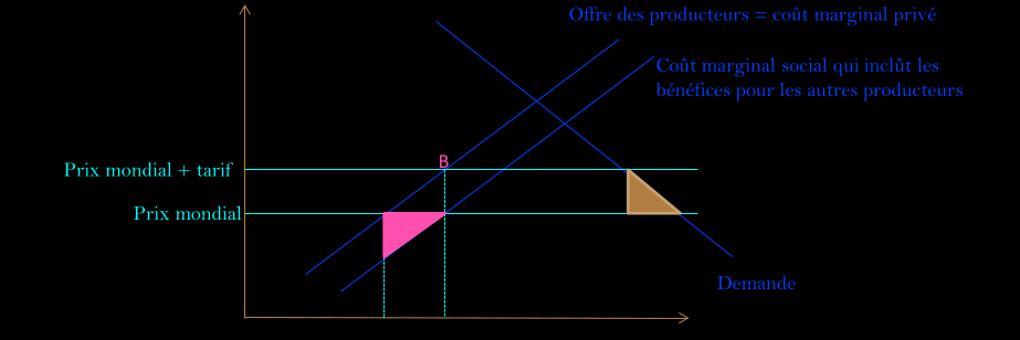 - Le tarif permet d’atteindre l’optimum social de production au point B, mais ca introduit une perte consommateur. Une subvention à la production aurait permis d’attendre B, et le gain d’externalité positive pour les autres producteurs sans introduire la perte consommateur. La subvention est la politique optimale, et le tarif n’est qu’un « second best » (politique de deuxième rang).