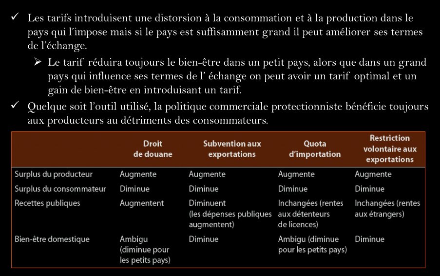 - Protéger les producteurs ou subventionner leur production (ex. agriculture en Europe), une subvention à la production est beaucoup plus efficiente que le tarif car elle n’introduit pas de distorsion côté consommation (donc le côté protection commerciale de la PAC est difficile à justifier).