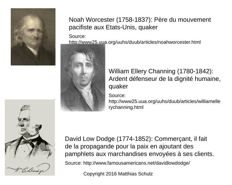 William Ladd (1778-1841): fondateur de l’American Peace Society (1828). Capitaine de marine jusqu’à la guerre de 1812, il se retire ensuite dans une ferme du Maine d’où il commence à militer pour le pacifisme.