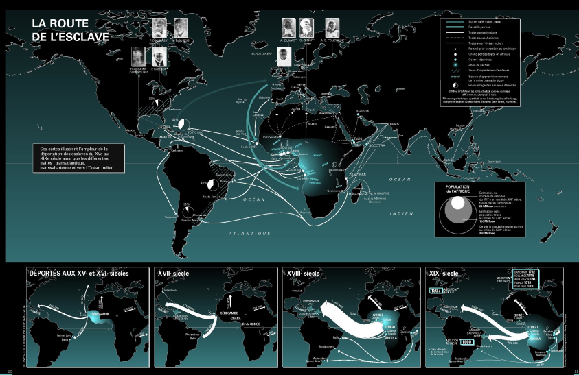 • Depuis XVe et jusqu’au XIXe siècle enlèvement et déportation d’environ 10 million Africains, surtout vers les Amériques et les Caraïbes, mais aussi vers l’Afrique du Nord et Asie centrale.