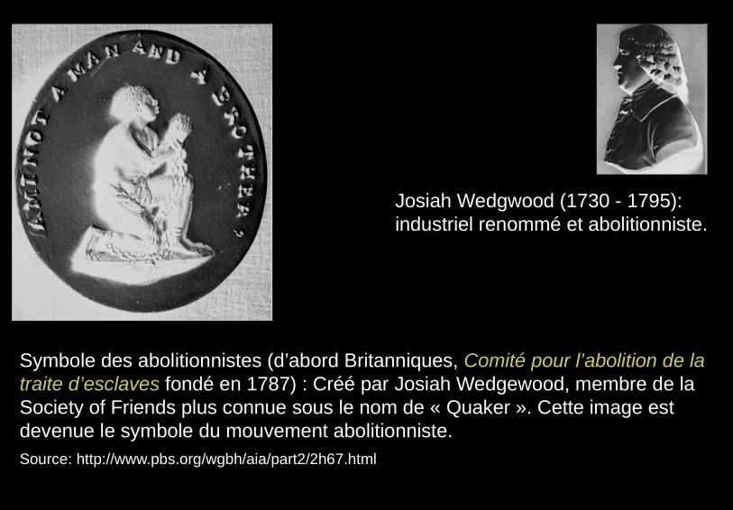 • 1787 fondation, au R.-U., du Comité pour l’abolition de la traite d’esclaves par Quakers et quelques Anglicans – Slogan: Am I not a Man and Brother?