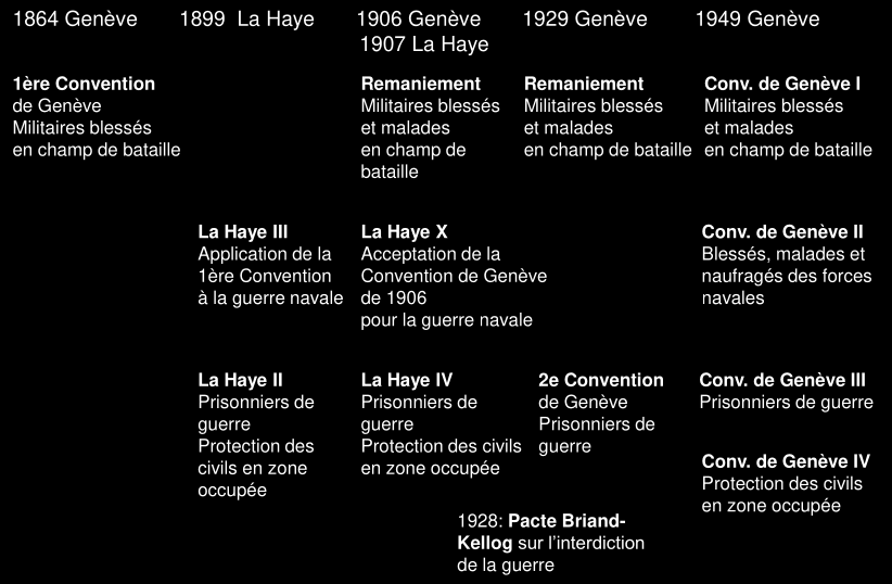 - Début du droit humanitaire de la guerre, C. ratifié par: deux grandes puissances + huit petits états, début du multilatéralisme ouvert,