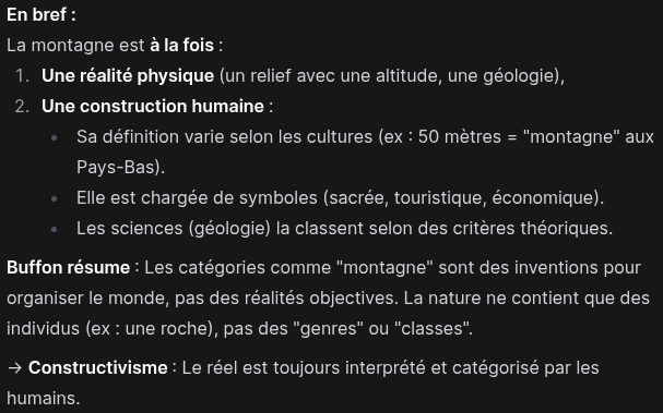 La montagne comme catégorie de la pratique sociale et/ou de la connaissance scientifique: Il n’existe réellement dans la nature que des individus, et (que) les genres, les ordres, les classes n’existent que dans notre imagination (Buffon, 1745).