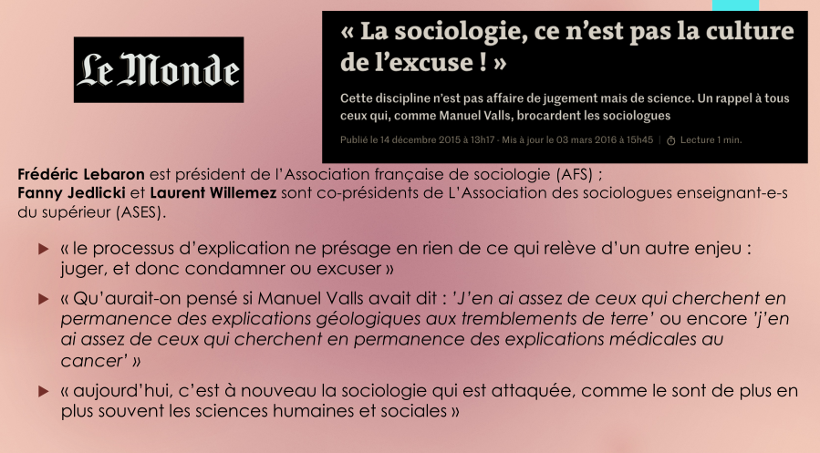 • La sociologie cherche à expliquer les faits sociaux par des causes sociales (ex : Durkheim).