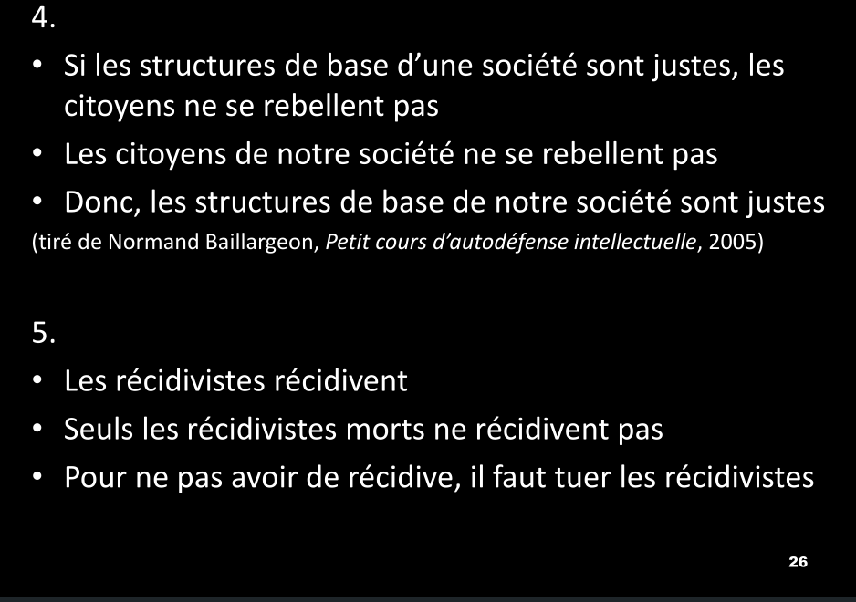 La 4 est fausse puisqu’il peut y avoir des structures pour empêcher une rébellion, et la société pourrait ne pas être juste même en absence de rébellion. Dans le cas de la 5 sa première premise ne dit rien, c’est évident que les récidivistes récidivent. On pourrait dire qu’il faut les mettre dans un état où ils ne peuvent pas récidiver, mais là notre raisonnement est tautologique.