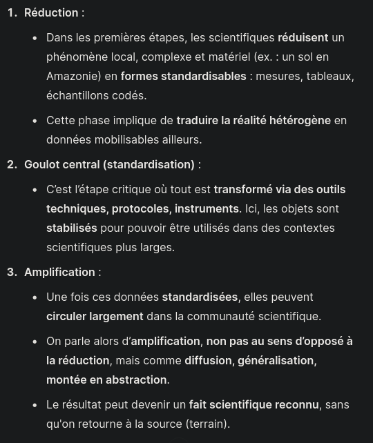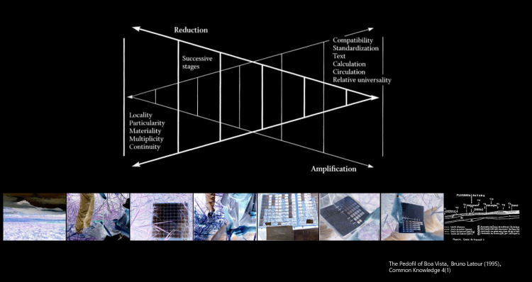 Le sablier de Latour. La traduction dans la science consiste en una réduction pour condenser quelque chose de très particulier et local dans un résultat laboratorisé et lisible, pour après l’amplifier et construire un réseau autour d’un énonce (la conclusion). Les sciences sont autonomes mais s’appuient l’une sur l’autre, ici les scientifiques étudient une carte pour mener leur recherche dans la foret amazonienne (géographie). Ils peuvent aussi extraire des échantillons et les classifier (chose essentielle pour toute science : mettre ensemble ce que l’on considère similairepartage suffisamment de caractéristiques). La classification nous prépare avant d’appliquer un code. L’objectif c’est laboratoriser le terrain, le faire lisible et contrôler certaines variables progresser vers la traduction. Ici on cartographie le type de sol par endroit dans une espèce de charte. Comme ça on sait : La savane dévore la forêt ou vice versa? Cela jusqu’à qu’on arrive à ce diagramme, qu’on aie traduit. Pour être objectifs, des techniques d’objectivation comme l’utilisation de mesures acceptées et utilisés auparavant sont utilisées. Ici on voit le code Munsell. Pour publier, on purifieélimination des hésitations. Ceci peut créer une image fausse de la science. En sciences sociales on ne fait pas que collecter des données, on raconte et on décrit. Bien sûr il y a des méthodes quantitatives, mais pas seulement.