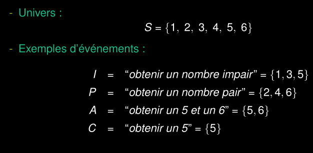 - Déterminer l’univers, qui sont les résultats possibles d’un tirage de dé :