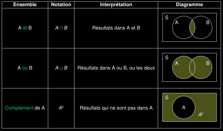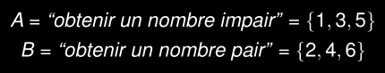 Lorsque les événements A et B (notés par A ∩ B) ne peuvent pas se produire simultanément (noté par A ∩ B = ∅), alors ils sont appelés événements mutuellement exclusifs. Leur somme peut-être inférieure/égale à 1.