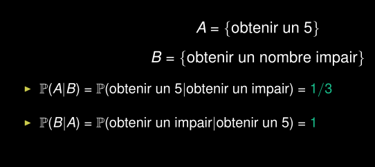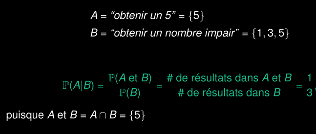 - Et la probabilité d’obtenir un 6 étant donné que le résultat du dé est un nombre impair ?