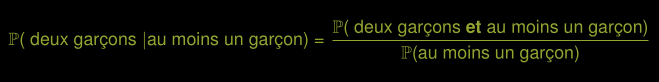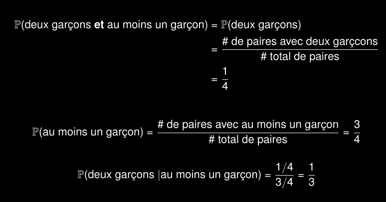 - La probabilité que les deux enfants soient des garçons étant donné qu’il y a au moins un garçon est: