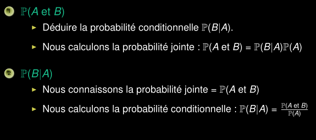 - P(A|B) = probabilité conditionnelle de A sachant B.