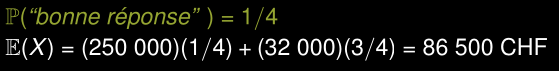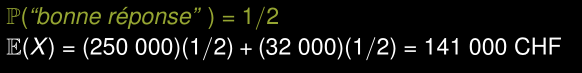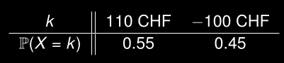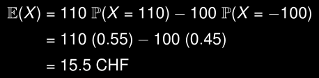 On a un pari et X est la quantité gagnée et 10 CHF nous sont donnés en plus. Donc a=10 CHF, c’est une constante dont on est sûrs du sort.