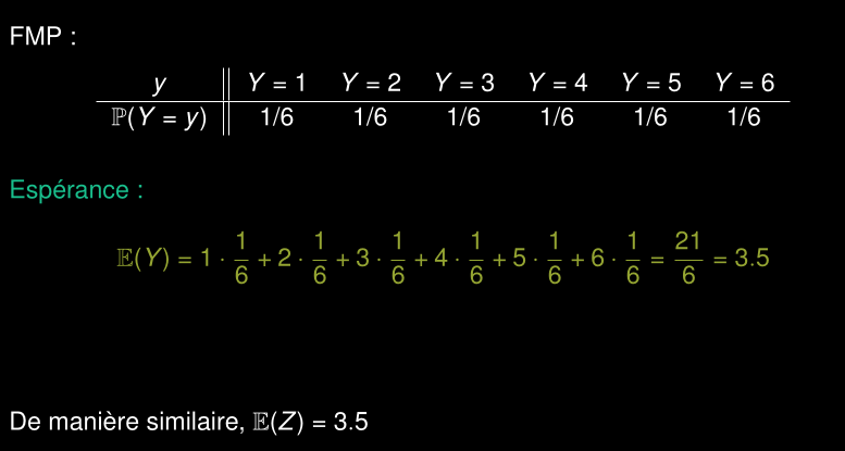 Déterminez l’espérance de Y et l’univers pour chaque dé bleu ou vert est: