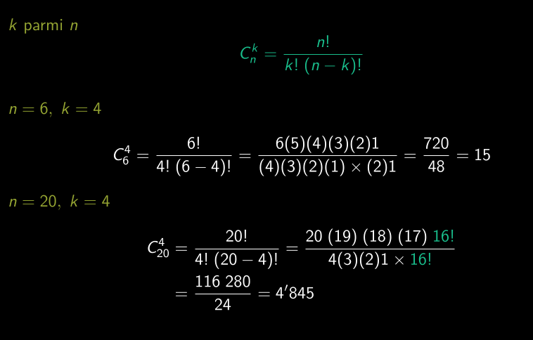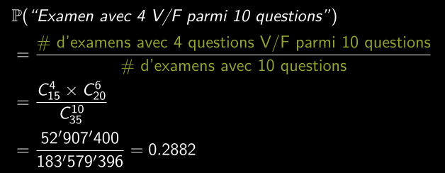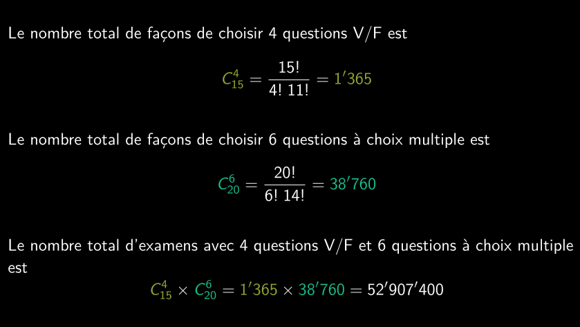Question : Nous voulons créer un examen avec 10 questions dont exactement 4 sont V/F. Combien d’examens avec exactement 4 questions V/F peuvent être construits ? Remarque : Ignorez l’ordre des questions.