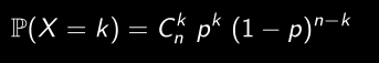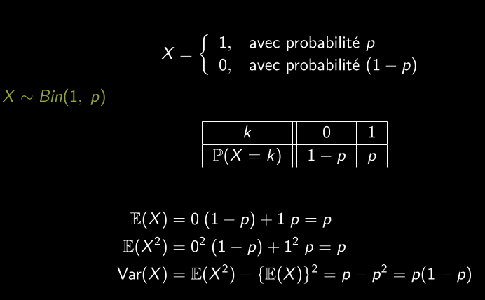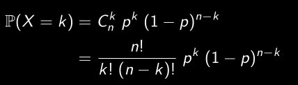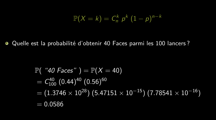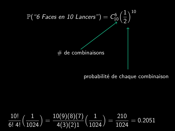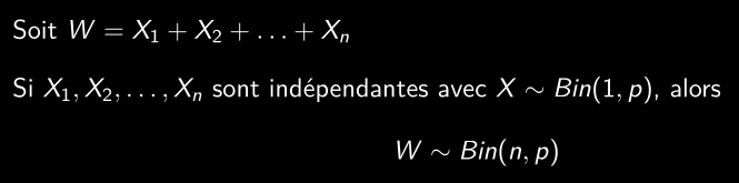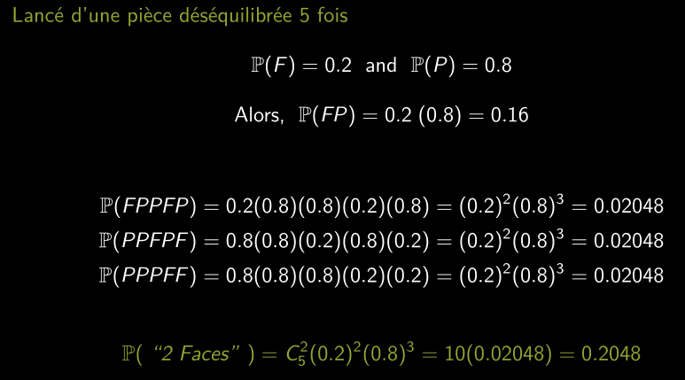 - Pour chaque essai, la probabilité de succès est p = 6/10 = 0, 6, elle est constante.