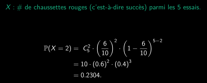 - Chaque tirage est indépendant des autres, puisque nous choisissons une chaussette à chaque fois avec remise.