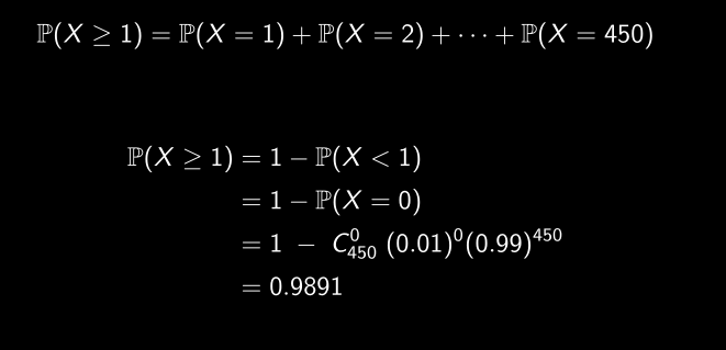 450 étudiants suivent le cours Introduction à la Statistique, mais la probabilité qu’un étudiant ne soit pas endormi à la fin d’un cours est de 0.01. Quelle est la probabilité qu’au moins un étudiant ne soit pas endormi à la fin du cours ?