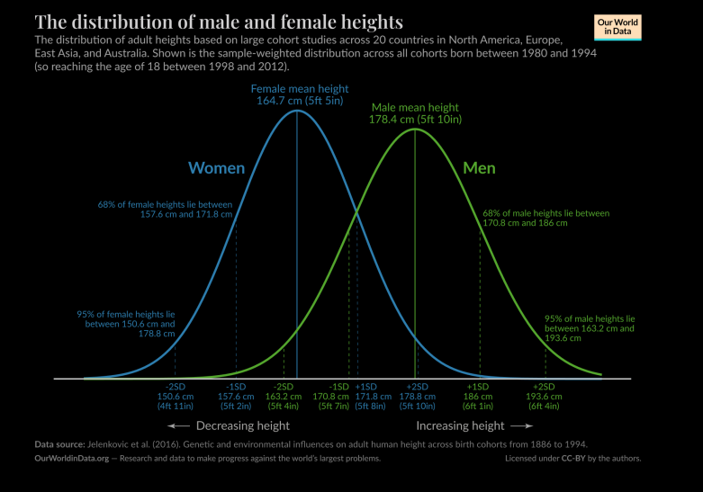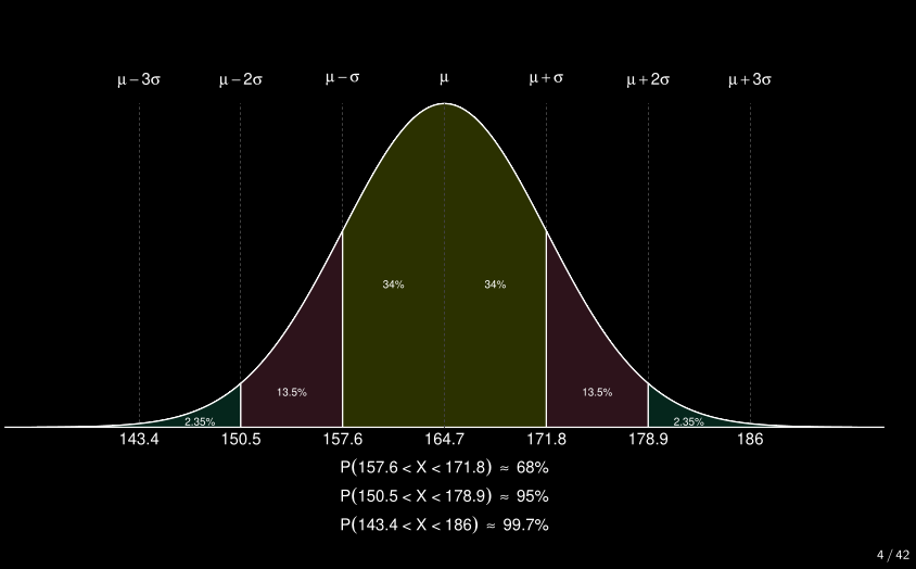 La hauteur des femmes en cm (dénotée X ) est distribuée normalement avec une espérance de 164.7 cm et un écart type de 7.1 cm: