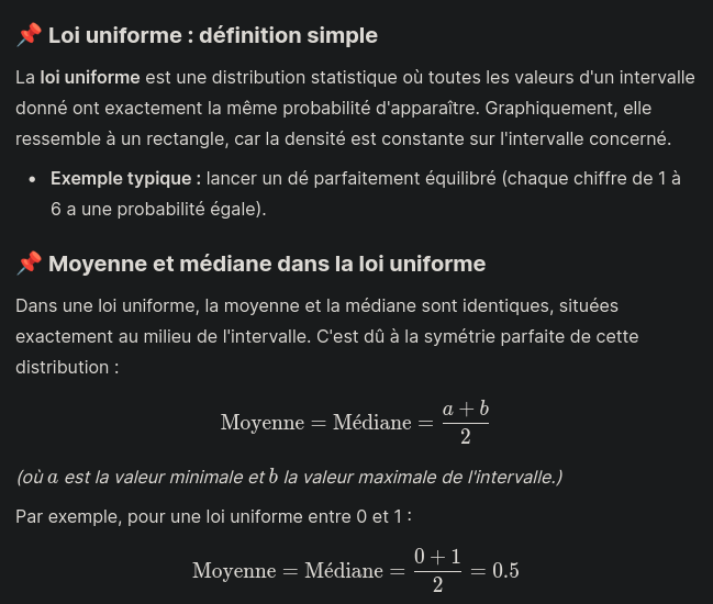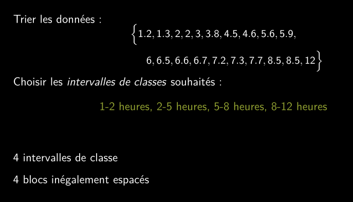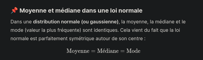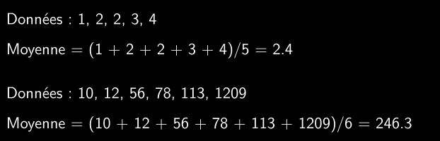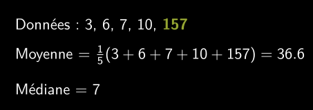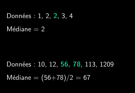 Un nombre égal d’observations plus grandes et plus petites que la médiane. Trier les données et considérer la valeur de l’observation centrale.