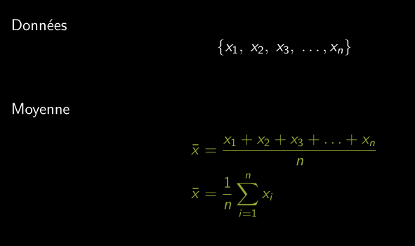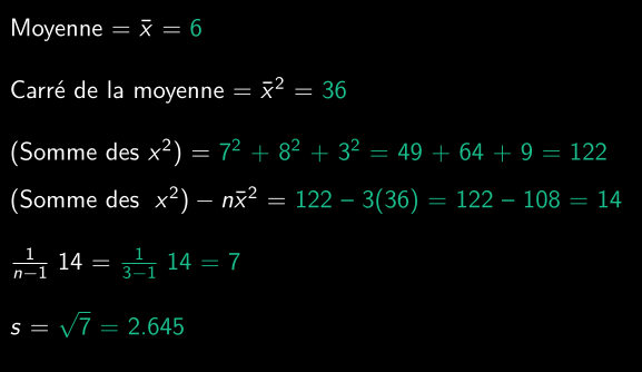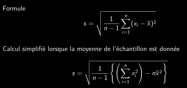 • Écart-Type (s) : Racine carrée de la moyenne des distances quadratiques à la moyenne.