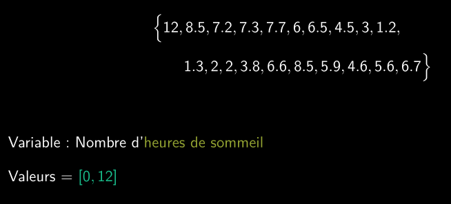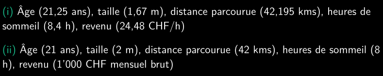 Nombres, mesures : âge, taille, distance parcourue, heures de sommeil, revenu, etc.
