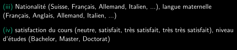 Classifier chaque observation : nationalité, langue maternelle, satisfaction du cours, niveau d’études, etc.