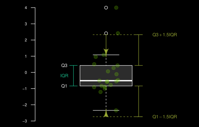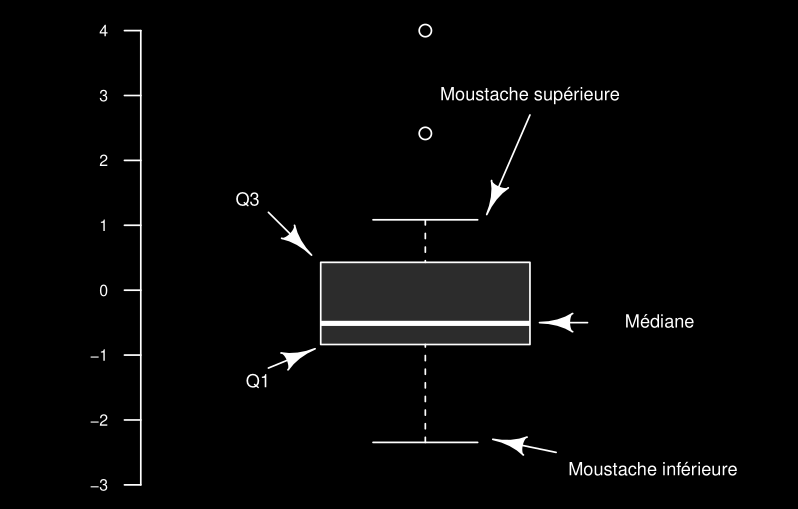• s dépend de toutes les données et peut être sensible aux observations éloignées (valeurs aberrantes). Les aberrantes apparaissent en dessous du Q1 et en haut du Q3 après une distance de 1.5 X IQR.