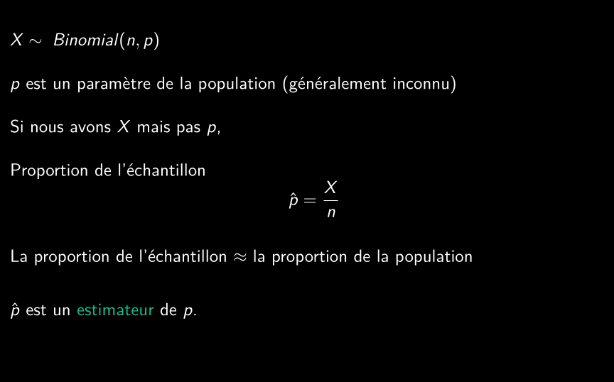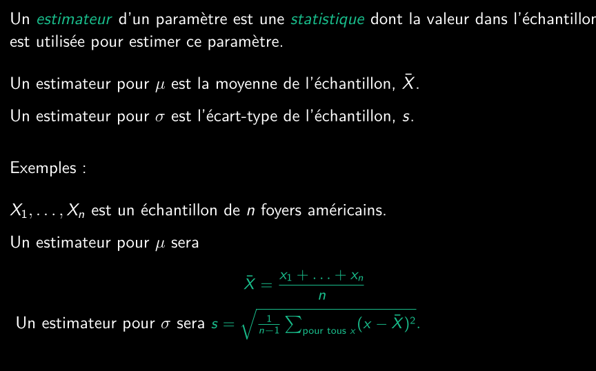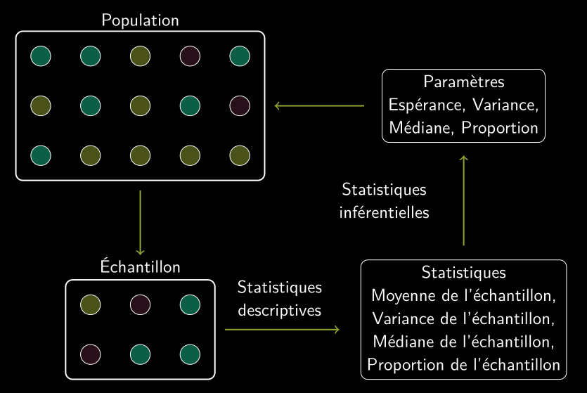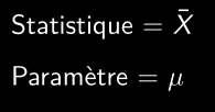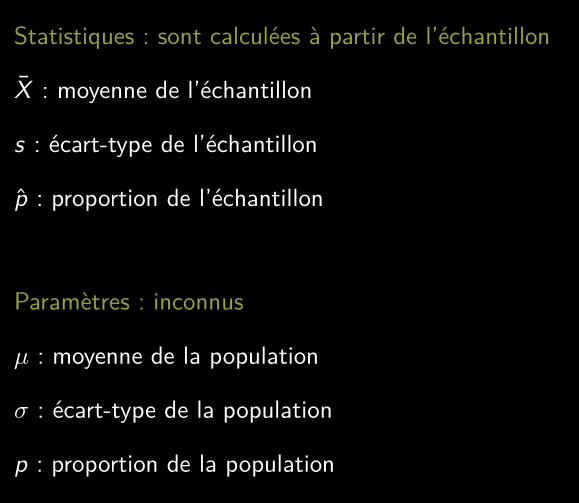 • Paramètre : une caractéristique de la population. Typiquement inconnue en raison du grand nombre d’individus dans la population et/ou de l’impossibilité de mesurer tous les résultats possibles.