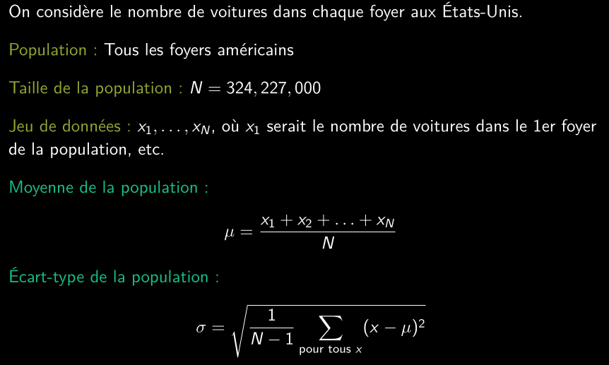 • Statistique : une quantité qui est calculée à partir des données que nous avons collectées de la population (échantillon).