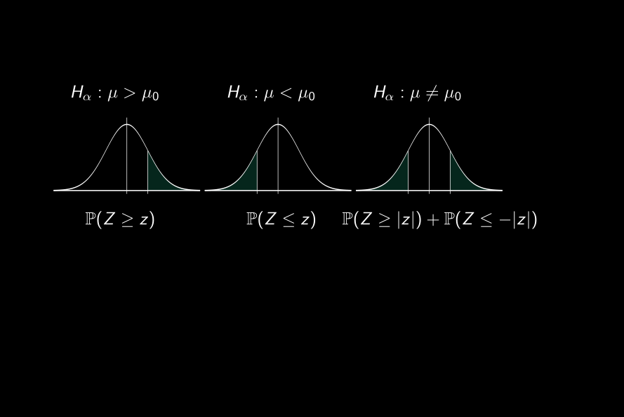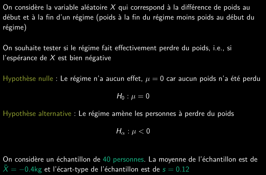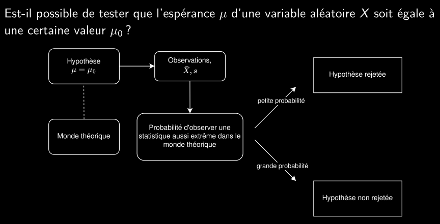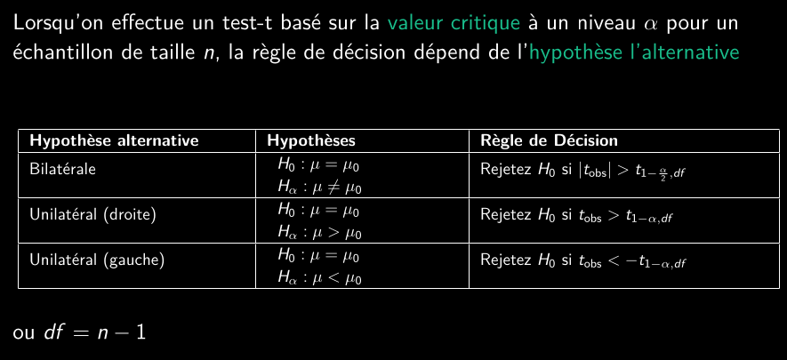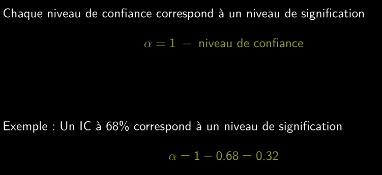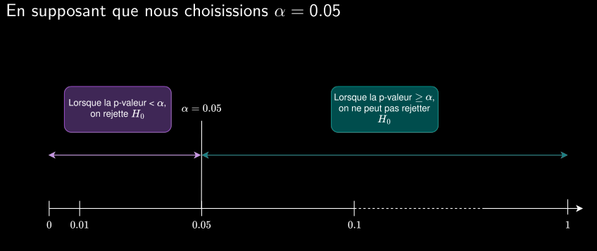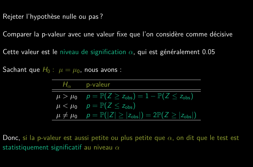 • Si α=0.05, nous exigeons que les données fournissent des preuves suffisamment solides contre l’hypothèse nulle pour que son rejet se produise au maximum 5 % du temps lorsque H0 est vrai.