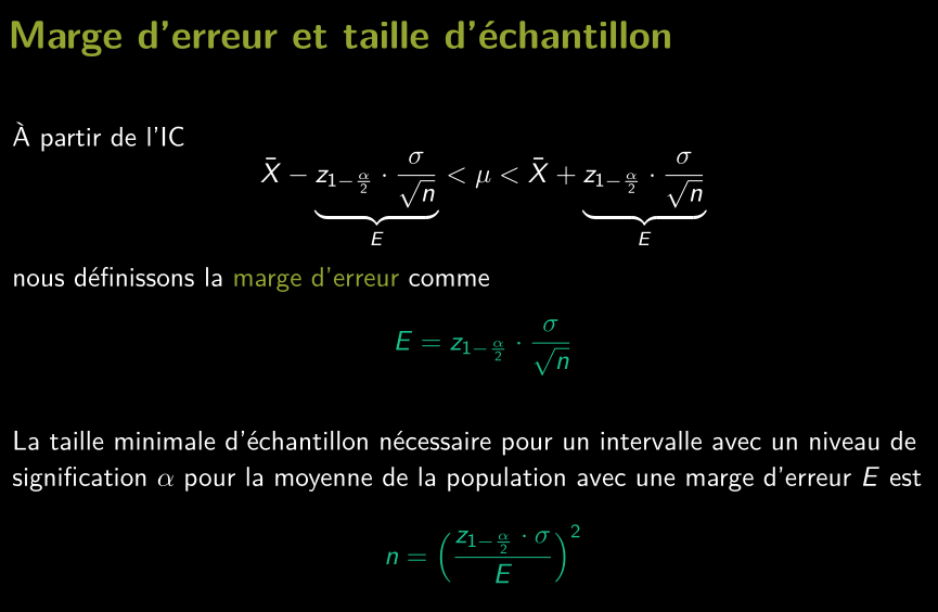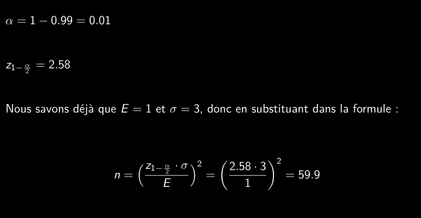 • En supposant que l’écart-type de la population est de 3 ans, quelle taille d’échantillon est nécessaire pour obtenir un intervalle de confiance à 99% pour l’âge moyen des étudiants avec une marge d’erreur E = 1 ?