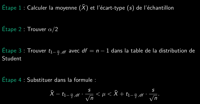 Étapes pour calculer un intervalle de confiance pour µ avec σ inconnu et n ≤ 30