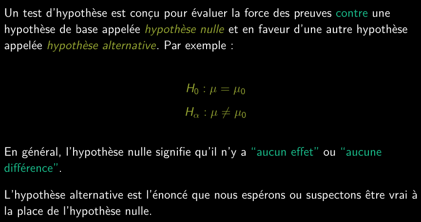 • Un test de signification est basé sur une statistique de test qui montre si les données fournissent ou non des preuves contre l’hypothèse nulle.