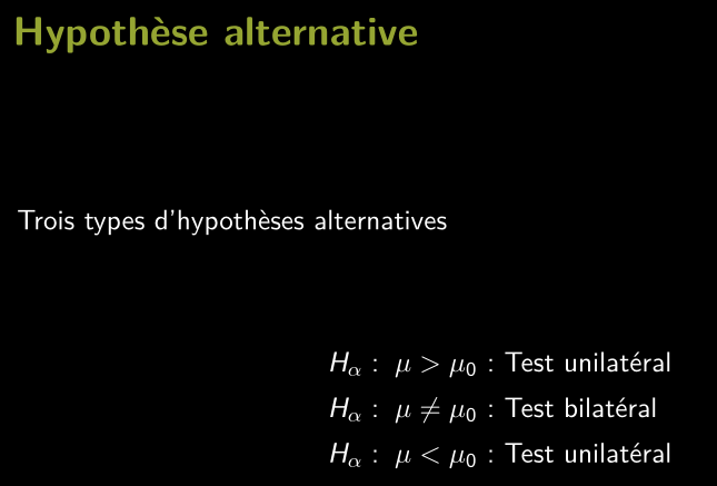• Des valeurs de l’estimation éloignées de celle spécifiée par H0 fournissent des preuves contre H0 . L’hypothèse alternative détermine dans quelle(s) direction(s) comptent les écarts contre H0.