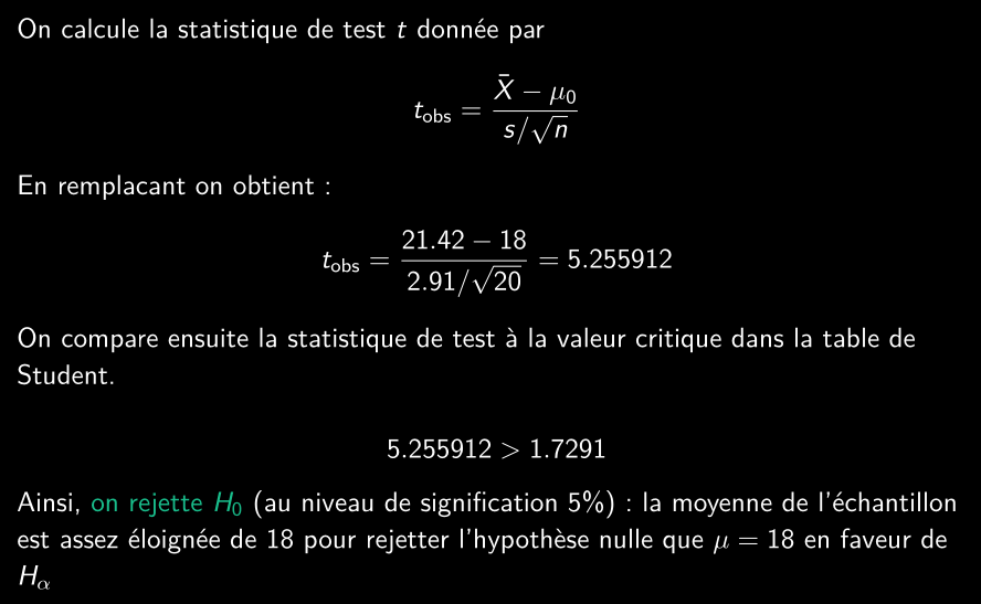 • Vous chercher à tester si l’âge moyen des étudiants est supérieur à 18 ans à un niveau de significativé de α = 0.05.