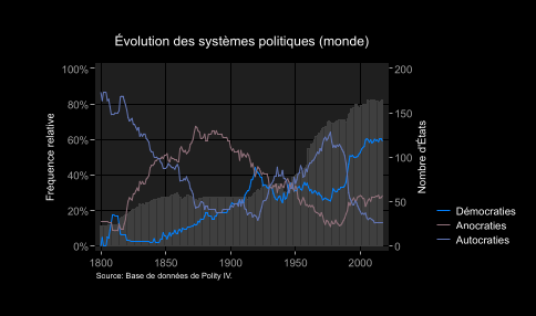 Les anocraties sont entre -5 et 5 pour le Polity IV, ce sont des régimes ou la population participe mais n’arrivent pas à être une démocratie complètement libre.