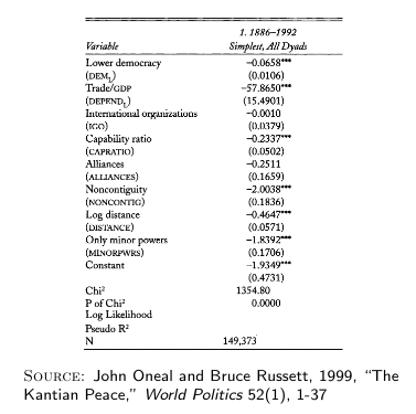Coefficient de la démocratie par rapport à la variable dépendante (guerre) est négatif→ + de démocratie = - de guerre.