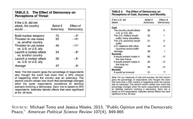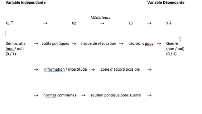 - Implications : démocraties a) sont attaquées moins souvent; b) initient que des guerres avec des bonnes chances de succès (ils doivent aussi être sérieux au propos de la guerre).