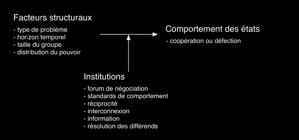 - Les institutions servent de forum de négociation, établissent des normes et standards, institutionnalisent la réciprocité, surveillent le comportement, lient les pays entre eux, augmentent le coût de trahison.