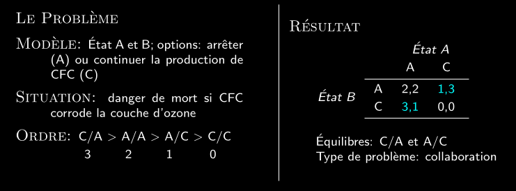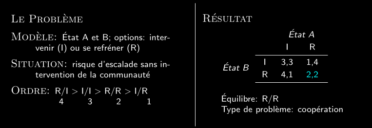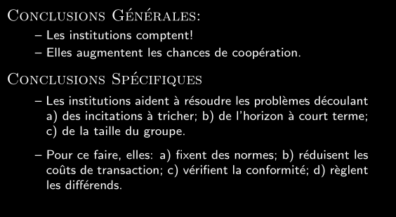 - Institutions : réduire l’ambiguïté; bien spécifier la coopération et la trahison.