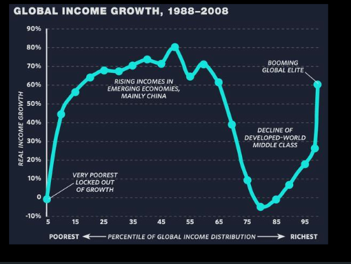 Les classes moyennes du monde développé sont celles qui ont connu le moins de progrès de leur richesse, elle a même décru. Les économies en développement comme la Chine ont gagné beaucoup, au contraire des pauvres (pays moins avancés qui ne peuvent pas se développer). Dans le cas des riches, ils ont beaucoup gagné.