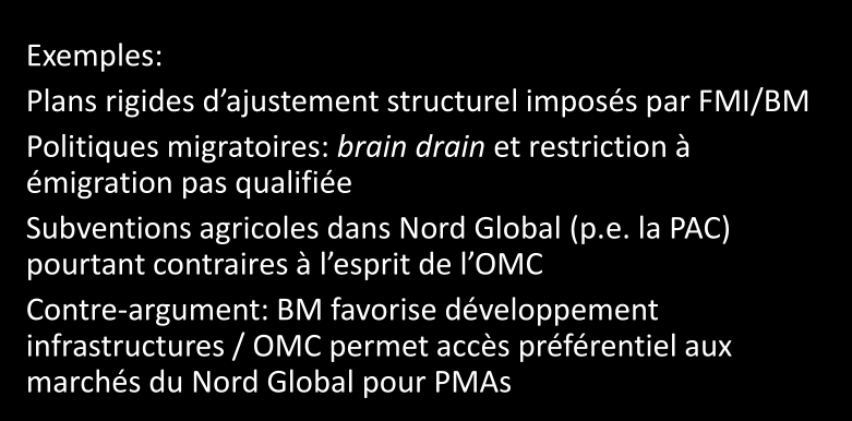 - Contre-argument : investissements directs favorisent développement via transfert de technologies et formation de la main d’œuvre locale.
