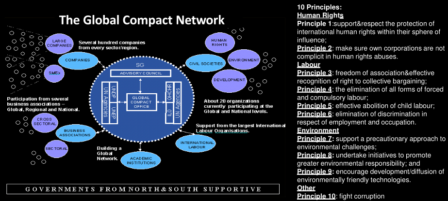 Les multinationales ont acquis du pouvoir. Leur fortune est supérieure aux PNB de certains pays. Microsoft est par exemple connu pour la Gates Foundation, elle est très importante dans le domaine de la philantropie. Ces organisations sont importantes dans le respect du droit international comme la protection de l’environment. Il y a des partenariats publics-privés dans l’ONU. La Global Compact Network est un exemple dans lequel les entreprises qui y participent démontrent leur bonnes actions en faveur des 10 principes du DI à respecter. Le réseau fut lancé en l’année 2 000. L’ONU peut faire des contre rapports en ligne dans le site web de la GCN.