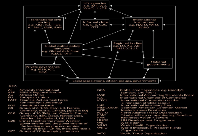 Les gouvernements sont tout en bas de ce schéma. Certains auteurs prennent les OIs plus au sérieux. Cependant les OIs perdent des nos jours de la fiabilité aux yeux de beaucoup de gens.
