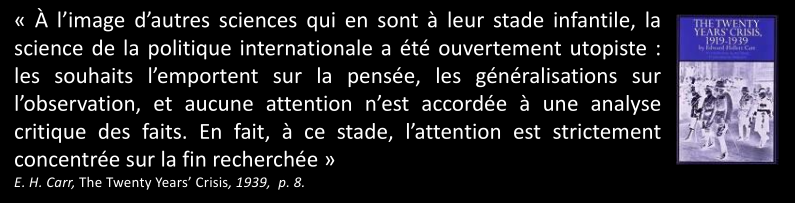 - Critique de l’orientation normative (idéalisme post-WW1) des premières publications en RI qui se focalisaient sur comment éviter de nouvelles guerres→ idéalisme: