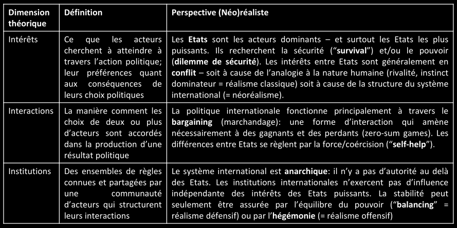 - Les Etats sont des entités unitaires (billiard balls) qui agissent selon les mêmes principes rationnels: self-help, security maximisation (= Néoréalisme défensif).