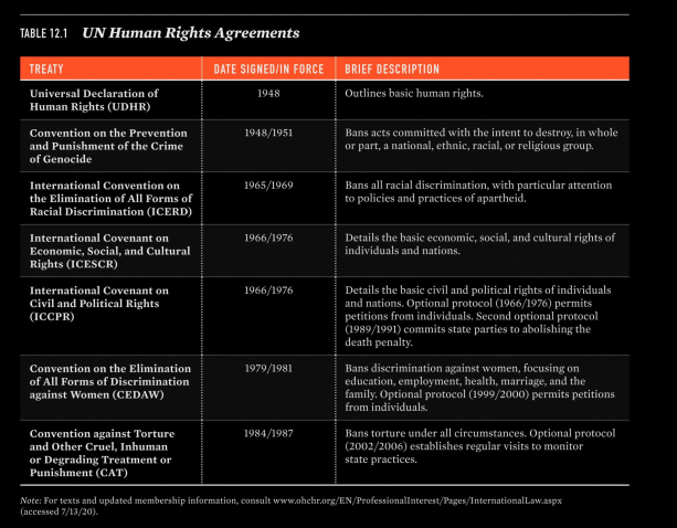 - International Bill of Rights = Déclaration Universelle des Droits de l’Homme (1948) + Pacte international relative aux droits civils et politiques (PIDCP / 1966) + Pacte international relatif aux droits économiques, sociaux et culturels (PIDESC / 1966).